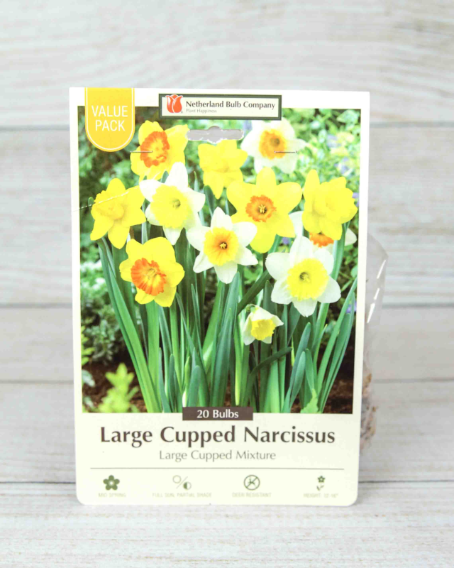 Large Cupped Narcissus are known for their traditional narcissus shape; a large flower on one stem with a large center cup. They are a great choice for a variety of garden settings and can be planted in borders, beds, or naturalized areas. Large Cupped Narcissus are also a popular choice for cutting flowers. Once established, the bulbs will multiply and come back year after year. Plant in the fall for spring blooms!