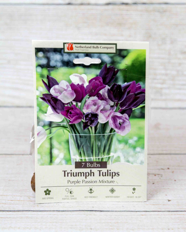 Purple Passion Mixture tulips are a mix of tulip bulbs that produce flowers in a variety of shades of purple, from light lilac to deep plum. The flowers can also be bi-colored or have fringed petals. Plant these bulbs in the fall for spring-blooming tulips.