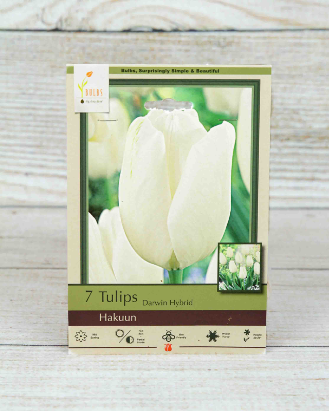 Hakuun tulips are a Giant Darwin Hybrid tulip that is known for its large, pure white flowers. The flowers are about 3 inches in diameter and are held on sturdy stems that grow 20-24 inches tall. Hakuun tulips bloom in mid-spring and are a good choice for borders, beds, and containers. One of the easiest bulbs to grow. Plant Hakuun tulips in the fall for spring blooms.