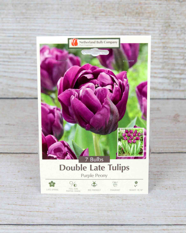 The 'Purple Peony' Tulip is a popular and dramatic variety known for its dense, multi-petaled blooms. It belongs to the Double Late classification of tulips, which are often affectionately referred to as Peony Tulips because of their striking resemblance to true peonies. The bloom is a rich, elegant deep purple and it extends the tulip season by blooming in late spring, often lasting well into early summer.