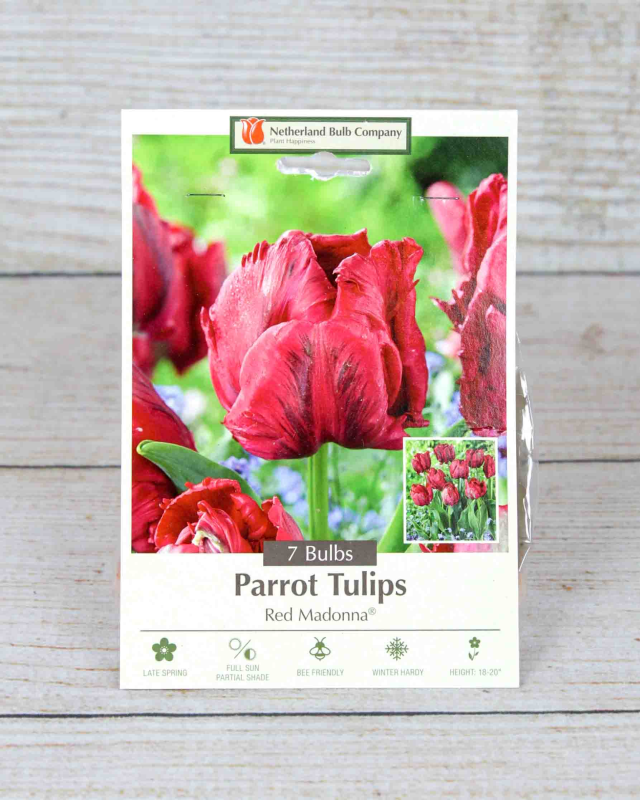 The Red Madonna tulip is a dramatic and eye-catching variety, categorized as a Parrot tulip. These tulips are known for their flamboyant, large blooms with ruffled, curled, and twisted petals that give them a unique, feathered appearance. The Red Madonna is a late-blooming tulip, typically flowering from mid to late spring. Plant these tulips in fall for spring blooms.