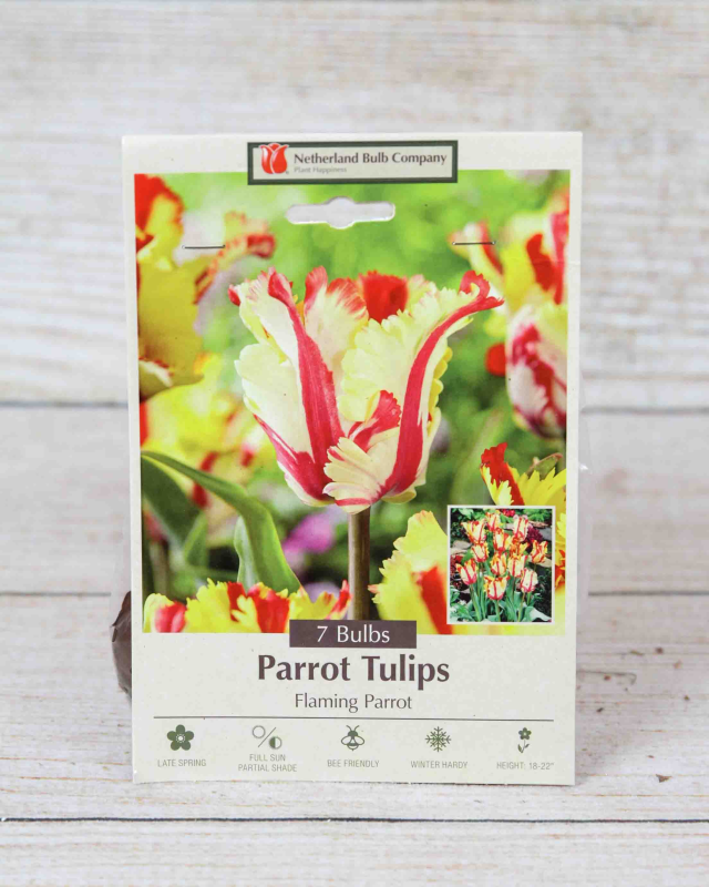 The Flaming Parrot Tulip is a spectacular and dramatic variety, renowned for its large, feathered, and ruffled petals. Each bloom is a unique work of art, with twisted and curled petals that resemble the flamboyant plumage of an exotic bird. The striking color pattern typically features a vibrant mix of scarlet red, golden yellow, and flashes of green. Plant these tulips in the fall for spring blooms.