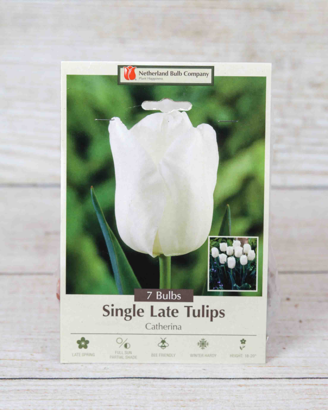 The Catherina Single Late Tulip is an elegant and popular variety of tulip known for its classic, refined appearance. It features large, egg-shaped flowers that are a creamy white with broad, ivory-white petal edges, often displaying a subtle buttercup-yellow base and dark yellow anthers.