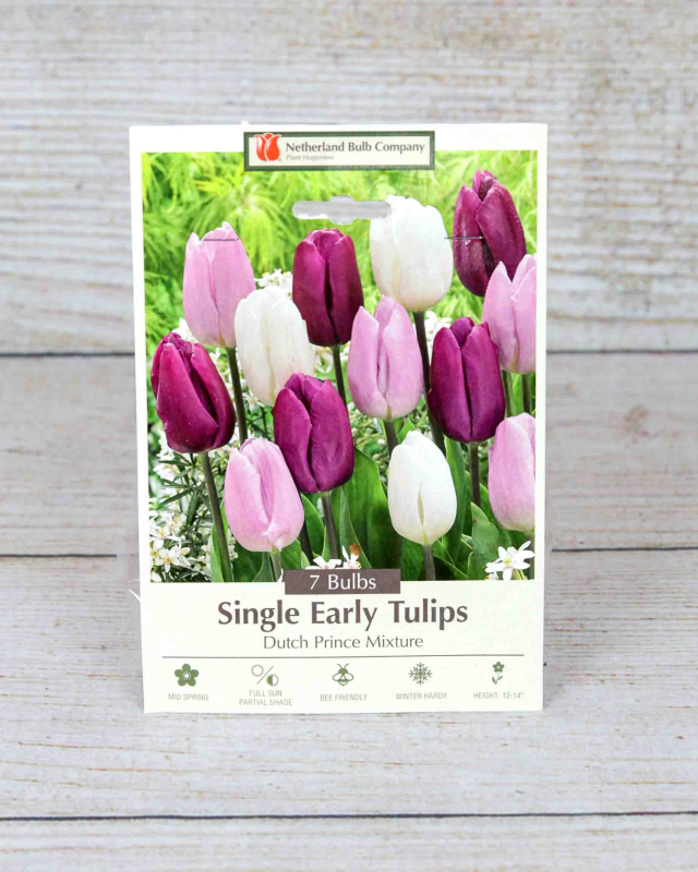 Dutch Prince Mixture Tulips offer a vibrant blend of purple colors, showcasing the beauty and versatility of the Dutch tulip. This mixture features a range of hues from dark purple, lavender, and cream. The cup-shaped flowers are typically large and eye-catching, with a slight sheen or shimmer.