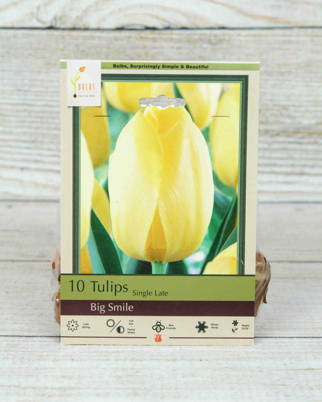 Big Smile tulips are a Single Late tulip that is known for its large, bright yellow flowers with a wide, open cup. The flowers are about 5 inches in diameter and bloom in late spring. Big Smile tulips bloom in mid-spring and are a good choice for borders, beds, and containers. Plant in the fall for spring blooms.