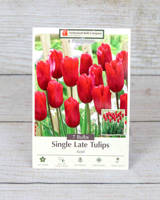 The Single Late Ariel tulip from Netherland Bulb Company is a popular variety known for its vibrant, late-spring blooms. This tulip features large, elegant, single-form flowers in a rich, bold red color. The blooms sit atop sturdy, upright stems that can reach a height of 20-24 inches, making them an excellent choice for borders, mass plantings, or as cut flowers for arrangements. Plant these bulbs in the fall for spring blooms.