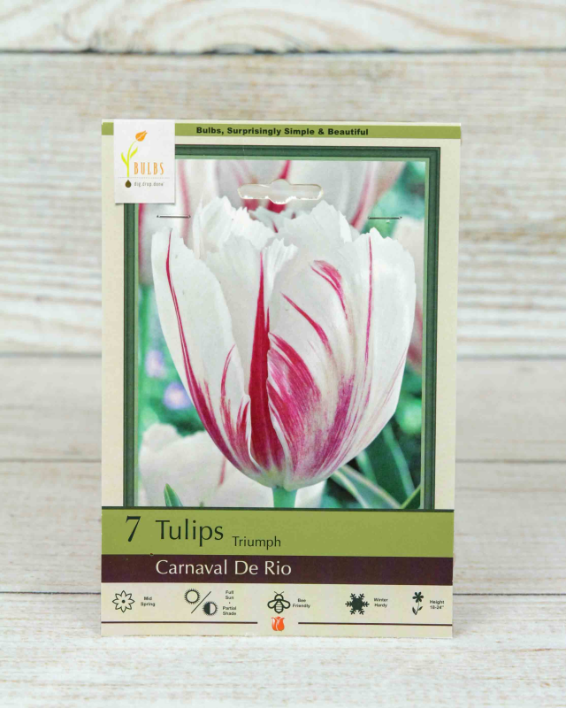 Carnaval de Rio tulips (Tulipa 'Carnaval de Rio') are a Triumph tulip variety that is known for their large, white flowers with deep red flames. The flowers are about 4 inches in diameter and bloom in mid-spring and are a good choice for borders, beds, and containers. One of the easiest bulbs to grow. Plant in well-drained soil in full sun or partial shade in the fall for spring blooms. They are a relatively easy plant to care for and can be propagated by dividing the bulbs or by seed.