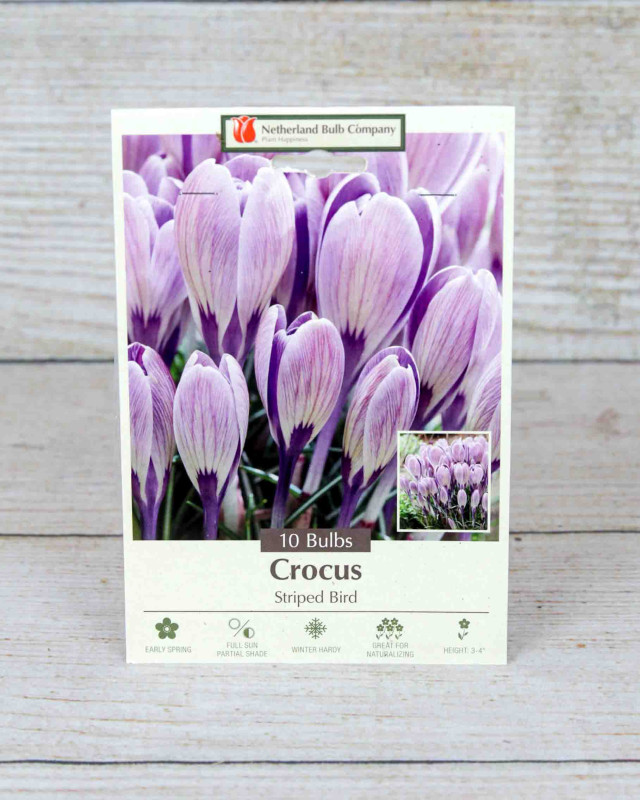 "Striped Bird" is a striking variety of snow crocus (Crocus tommasinianus) known for its unique appearance and early bloom time. The chalice-shaped flowers are a soft violet or pale purple, with each petal intricately striped with creamy white and deeper purple veins. This delicate, feather-like pattern gives the flower its distinctive name. Easy to grow in well-drained soil in full sun to partial shade. They are extremely hardy, and will even bloom during a snowstorm. Plant these bulbs in the fall for spring blooms!