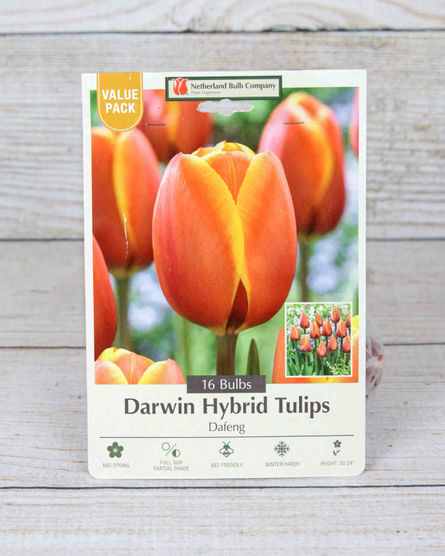 The Dafeng Darwin Hybrid Tulip is a stunning variety known for its classic, cup-shaped blooms and vibrant, cheerful color. As a Darwin Hybrid, it is recognized for its large, long-lasting flowers and strong, sturdy stems that hold up well against wind and rain. The flowers are typically a brilliant, bright orange, sometimes with shades of soft coral or amber, creating a beautiful and striking display in any garden. Plant these tulips in the fall for spring blooms.