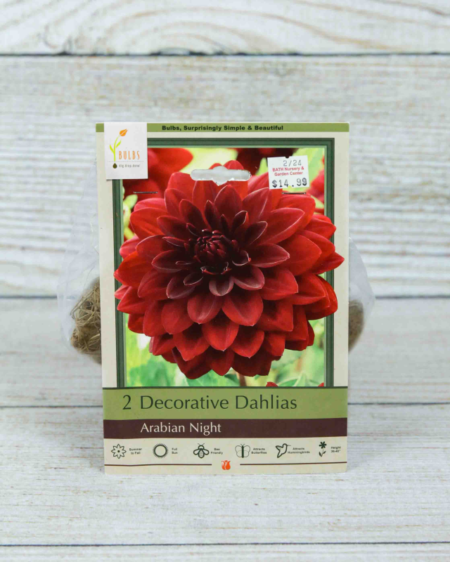 Arabian Nights Decorative Dahlia lives up to its name, offering a captivating display of dark, dramatic blooms. The Arabian Nights has an abundance of large, 6-8 inch blooms in a stunning shade of burgundy. Unlike completely black flowers, the Arabian Nights dahlia often has subtle hints of red or purple within its petals, adding depth and complexity to the overall color.
