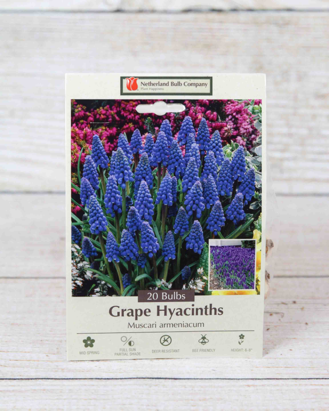 Grass-like foliage supports beautiful cone-shaped flowers. These small bulbs produce clusters of tiny, bell-shaped flowers that resemble bunches of grapes. Muscari are a Dutch favorite because they are deer resistant, naturalize well, and easy to grow in well-drained soil in full sun to partial shade. Plant in the fall for spring blooming bulbs.