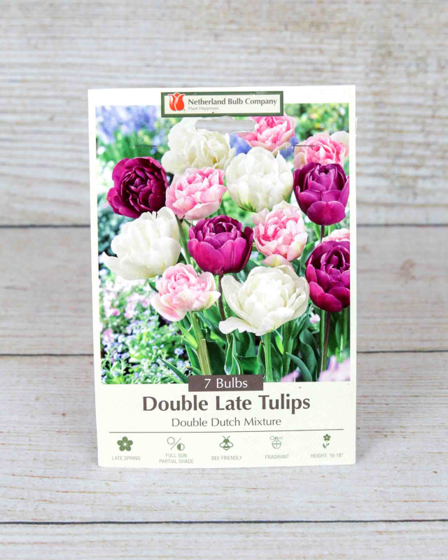 These tulips are known for their spectacular, peony-like blooms that add a lush, dramatic flair to any spring garden. The mix typically features a vibrant array of colors, often including shades of pink, purple, white, and yellow, with each flower boasting multiple layers of petals. Blooming later in the spring season, they help to extend the tulip display and are excellent for use as cut flowers in bouquets due to their long-lasting nature. Double late tulips are also quite tall and have strong stems, making them a beautiful and reliable choice for borders, beds, and mass plantings. Plant in the fall for late spring blooms.