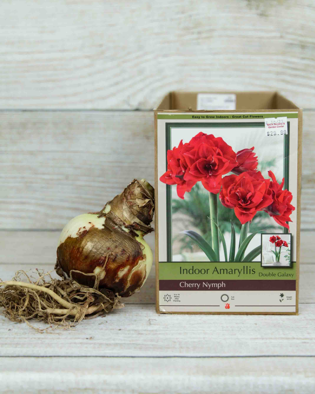 Winter can be a hard time for gardeners, but that is the great thing about amaryllis! They are exquisitely beautiful, producing huge blooms, each as big as your hand, and are also easy to grow indoors with just a few steps. Cherry Nymph Amaryllis is a stunning and elegant flower with velvety, cherry red, double flowers that can grow up to 8 inches across. The flowers are borne in clusters of four atop a stout leafless stalk.