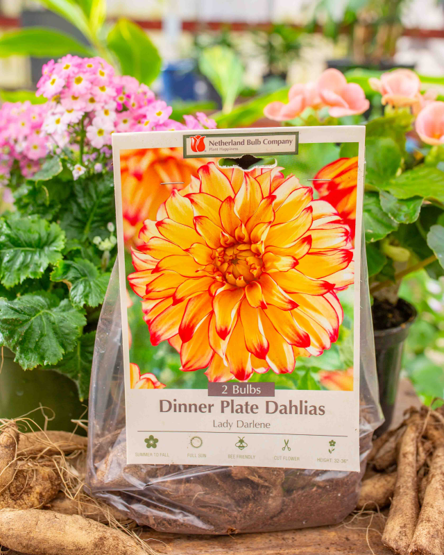 Add impact and rich color to the landscape with the massive blooms of Lady Darlene. Showy yellow petals with red midribs and tips give it a flame like appearance. These stunning flowers grow 9" in diameter and prove to be a spectacular show in sunny borders and vases. Blooms all summer long through October.