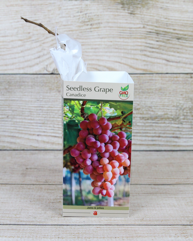 Canadice seedless grapes produce 25-40 clusters of fruit per wine in the late summer. Each vine requires about 15 feet of growing space on a wire trellis or fence with at least 8 hours of sunlight. Canadice seedless grapes are great self-pollinators, and taste delicious for fresh eating, making jams, jellies, and wines. They're also winter hardy!