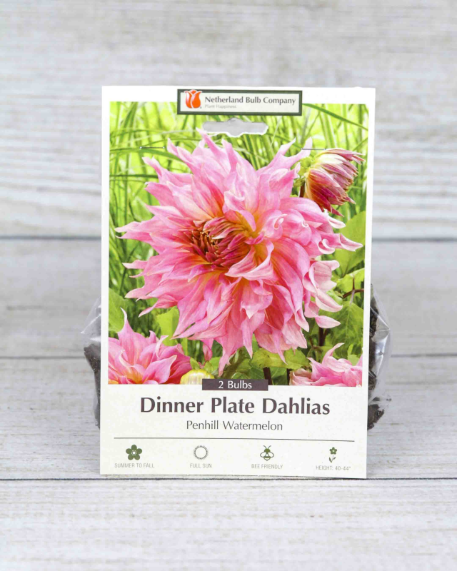 Penhill Watermelon Dinner Plate Dahlias are a show-stopping addition to any garden, boasting enormous, vibrant blooms that resemble their namesake fruit. These dahlias produce flowers with a captivating blend of soft pink and creamy yellow hues, creating a watercolor-like effect that's both delicate and dramatic. The massive, fully double flowers, reaching up to 10 inches in diameter, are held aloft on sturdy stems, making them excellent for cut flower arrangements.