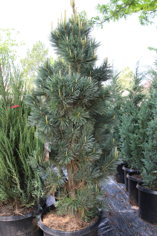 An increasingly popular selection, 'Vanderwolf's Pyramid' (Pinus flexilis) makes a dramatic specimen tree or an effective screen or small grouping in large garden beds and borders. Long, blue-green needles cover the uniformly ascending branches, which together form a large, upright, pyramidal tree that broadens with age. Superb color and soft texture add a formal, but friendly look to the landscape. Prefers moist, well-drained soil.