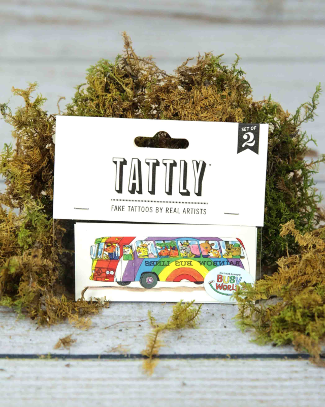 Calling all fans of Richard Scarry's Busy World! Tattly has a temporary tattoo sheet featuring the iconic Busy World Bus. This fun and colorful tattoo lets you ride along with all your favorite characters from the beloved children's books.