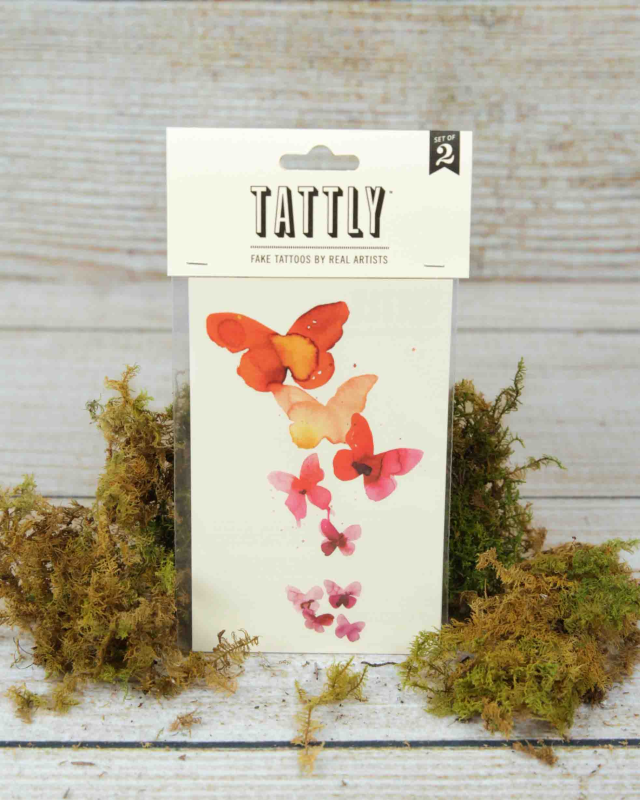 Let your heart flutter wearing Coral Butterflies by Stina Persson. Each pack includes two butterfly tattoos in shades of coral and orange, perfect for a touch of summer on your skin. Tattly tattoos are safe and printed with vegetable-based ink, lasting on average 2-4 days.