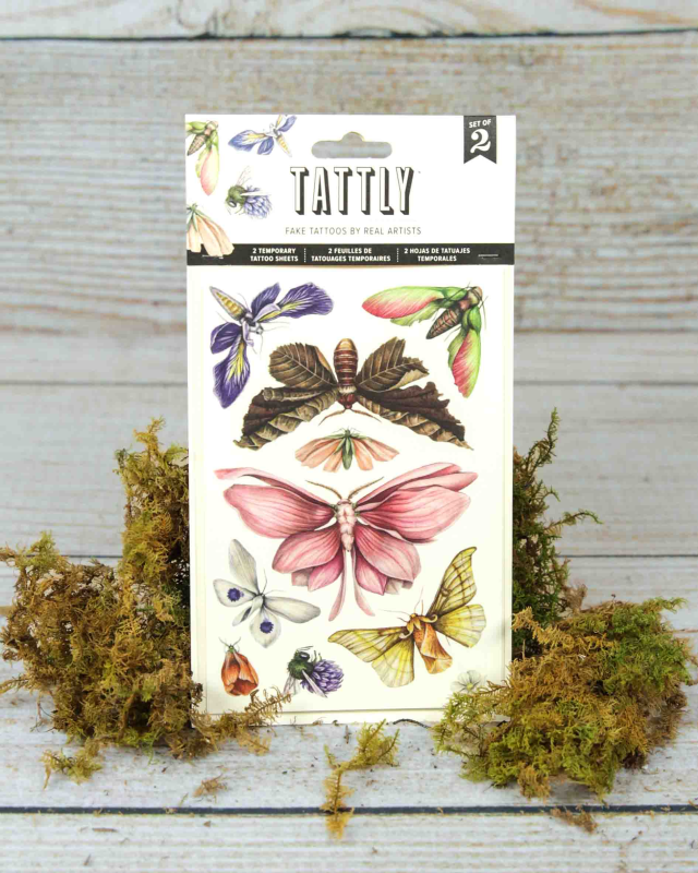 This collection of moths are made from flowers that grow in your backyard, including magnolias, iris, helicopter seeds, and clover blossoms. Each card is 4x6 inches, and includes one sheet of temporary tattoos.