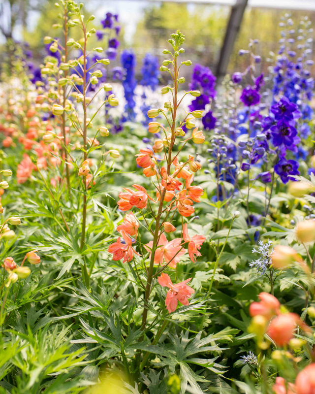 Each bloom of the Delphinium features intricate petals that attract pollinators such as bees and butterflies, enhancing the ecological health of your garden. Colors range from orange, purple, blue, pink, and red. Specific varieties found in-store. In addition to their visual appeal, delphiniums are relatively low-maintenance once established.