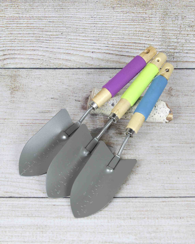 The Bond Bloom wooden trowel is a classic gardening hand tool designed for various tasks, from planting seedlings to transplanting flowers and loosening soil. The wooden handle is comfortable to grip and provides good leverage when working with the tool. Choose between a blue, green, or purple foam handle.