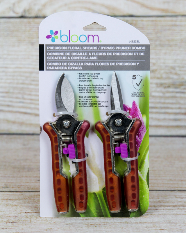 The Bloom Brand Precision Floral Shears/Bypass Pruner Combo is a must-have toolset for floral enthusiasts and professional florists. This versatile combo combines the precision of floral shears with the cutting power of a bypass pruner, making it perfect for a wide range of floral arrangements and gardening tasks. The floral shears feature fine, pointed blades that are designed to make precise and delicate cuts. The bypass pruner, on the other hand, offers a robust cutting action and ensures clean and accurate cuts on thicker branches, stems, and other tougher materials.