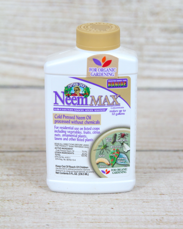 Bonide Neem Max Concentrate is a botanical insecticide, fungicide, miticide, and nematicide that is made from the neem tree. It is a safe and effective way to control a variety of pests and diseases in the garden, including aphids, spider mites, whiteflies, powdery mildew, rust, and more! Cold Pressed Neem oil is a plant based active ingredient.