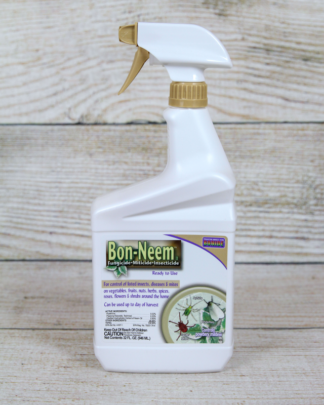 Neem oil is a naturally occurring pesticide found in seeds from the neem tree and is safe to use on roses and other flowers, vegetables, herbs, spices, indoor houseplants, trees, turf, shrubs, and any other organic gardening you may perform. Bon-Neem contains neem oil plus pyrethrins, which is a naturally occurring insecticide found in some chrysanthemums.