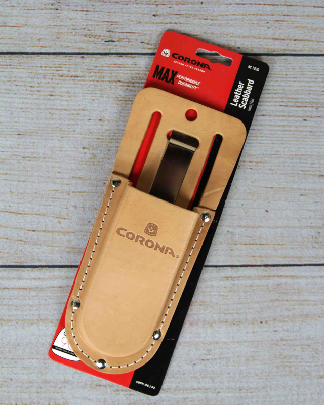 The Corona Leather Scabbard is a sheath designed to carry and protect pruning tools. Made from top-grain leather, the Corona Leather Scabbard is built to last. The seams and stress points are stitched and riveted for added durability and to prevent tears.