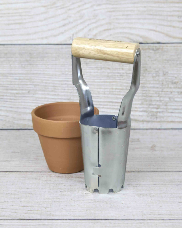 The Standard Bulb Planter is designed to make planting bulbs easy and convenient. The planter features beveled edges that make it easy to pierce the soil and create a hole for the bulb. The tool's shape allows for a deep enough hole to plant a variety of bulbs at different depths.