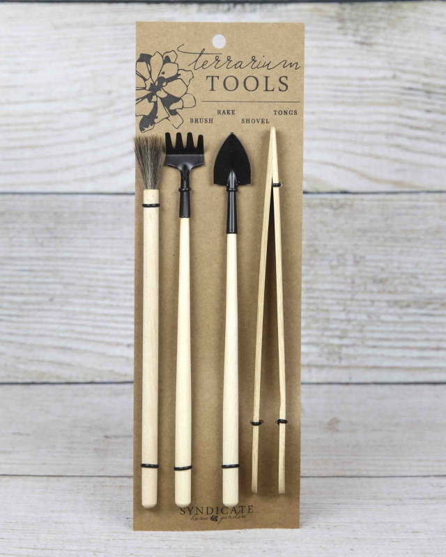 The Syndicate 4-piece Terrarium Tool Set is a comprehensive set of tools designed to help you create and maintain a beautiful terrarium ecosystem. The set includes a pair of tongs, a rake, a shovel, and a brush, all crafted with precision and attention to detail.