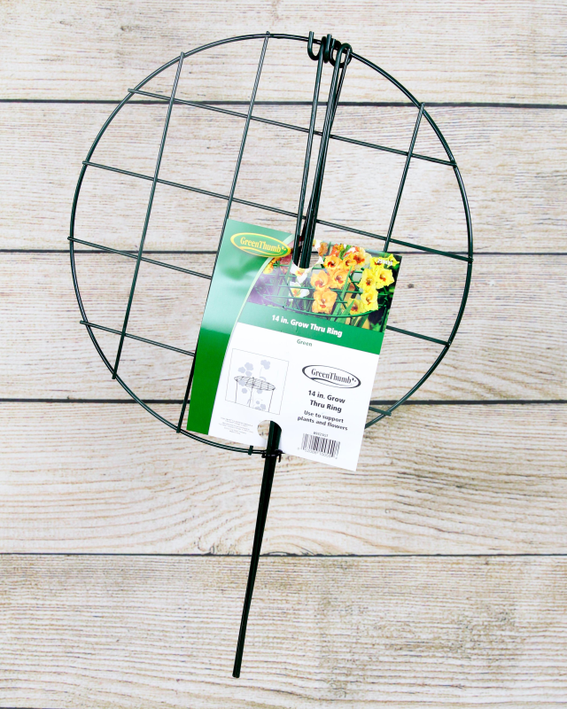 The Grow Thru Ring Plant Supports by Green Thumb are 14 inches in diameter and have holes in the center that allows the plants to grow through. This helps to keep the plants upright and prevents them from becoming tangled. Very easy to use. Simply insert the rings into the ground and plant your chosen plants around the outside or even underneath the ring. The plants will eventually grow through the center of the ring, creating a beautiful and functional addition to your garden. Can also be inserted into the ground as plants become taller to help stabilize stems.