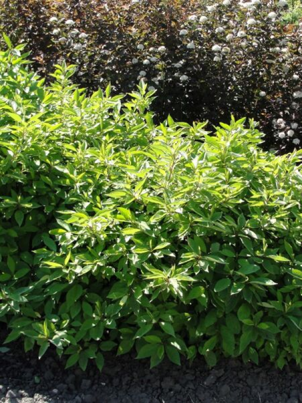 Hardy, dwarf, slow growing shrub with green-tinged red stems that turn blood-red in fall/winter. Compact branching habit with crisp green foliage in summer and clusters of cream-white blooms. Shade tolerant. Prefers moist, well-drained soil.