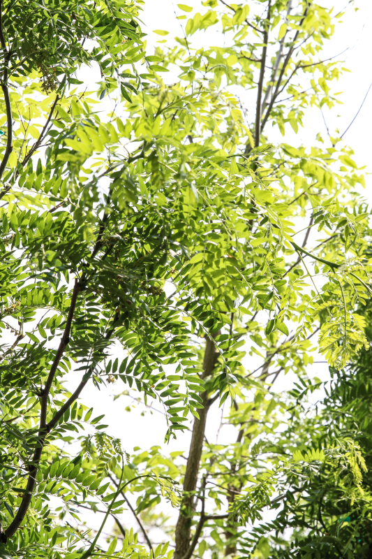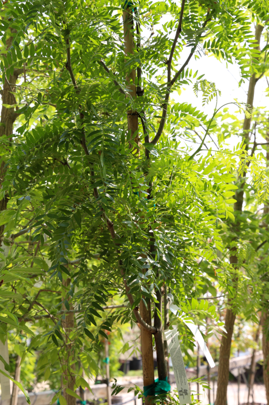 The Skyline Honeylocust tree (Gleditsia triacanthos inermis 'Skycole') is a strong and sturdy upright tree. It matures into a distinctive pyramidal form with dark green, fern-like foliage that turns golden yellow in the fall. This variety is thornless, and essentially fruitless, and is a valuable tree for light, filtered shade.