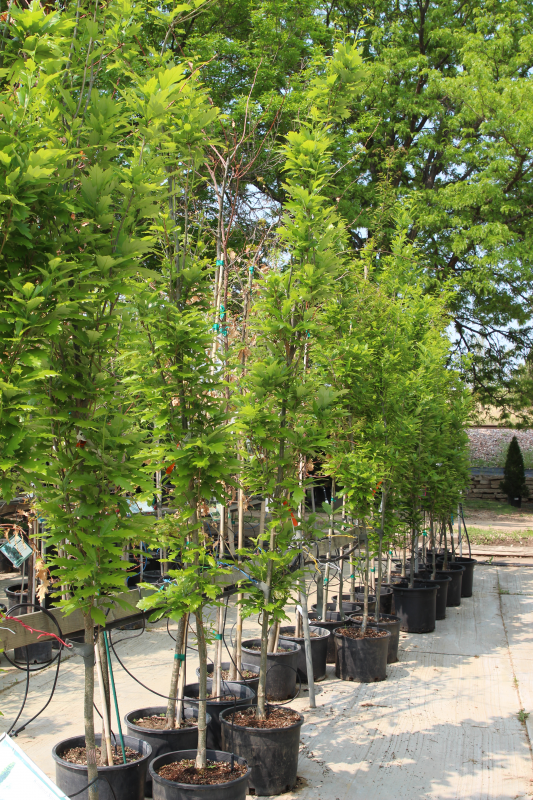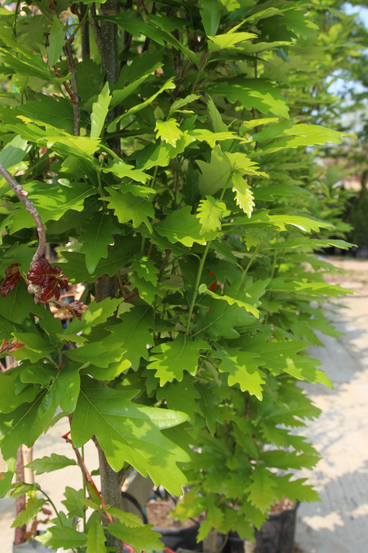 Kindred Spirit Oak trees (Quercus x 'Nadler') are tall, upright hybrids of the Swamp Oak and Columnar English Oak trees. They grow in a column shape, making them ideal for compact spaces like small residential landscapes and urban yards. Once established, the Kindred Spirit Oak is resistant to powdery mildew, tolerates drought, and can withstand clay soils. This tree also produces acorns! Perfect for providing food to the small animals in your yard.