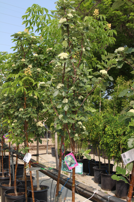 The Oakleaf Mountain Ash trees (Sorbus x hybrida) with large, lobe-shaped leaves are perfect for adding beauty and diversity to your landscape. With their striking clusters of white flowers in the spring, followed by small, vibrant red-orange berries in the fall that attract birds and other wildlife, these trees provide a stunning visual display year-round. Oakleaf Mountain Ash trees are hardy and tolerant of a wide range of soil and climate conditions, making them an excellent choice for any garden or park.