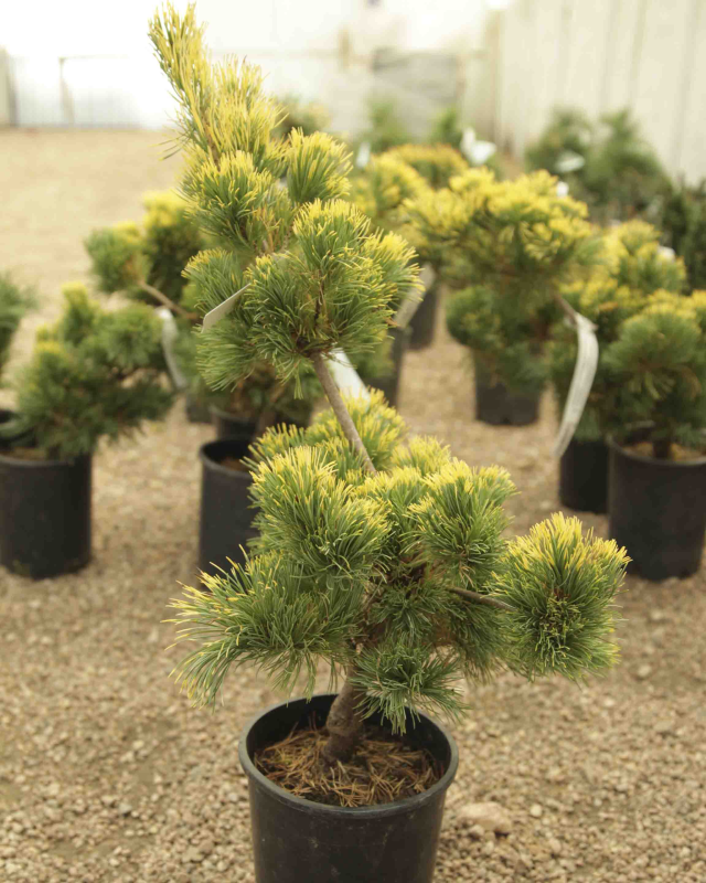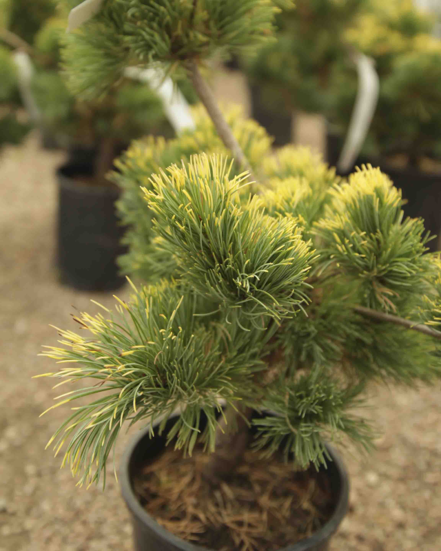 A naturally artistic, sweeping habit makes Pinus parviflora ‘Goldilocks’ a unique garden specimen. An overlay of soft, golden highlights contrast the silver undertones on the curved, green needles. For optimum color, seek a balance between sun and shade. Well-drained soil is required for this beauty to thrive.