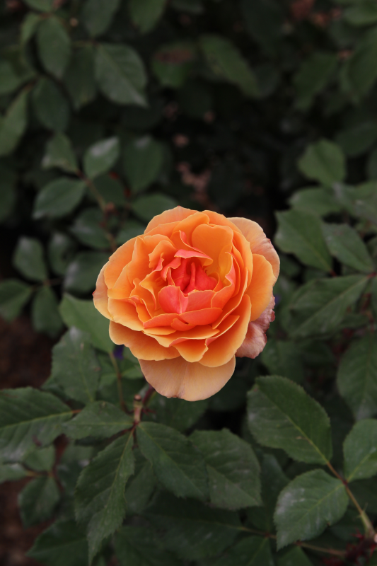 The fully double, apple scented flowers are golden-orange on the inside & bronzy-red on the outside. The tall, very upright plant has lush clean green leaves.