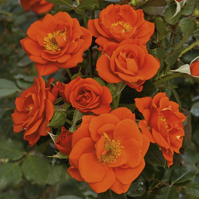 Loads of shiny bright persimmon blooms sparkle against the abundant deep glossy green foliage. Best flower size in cooler conditions.