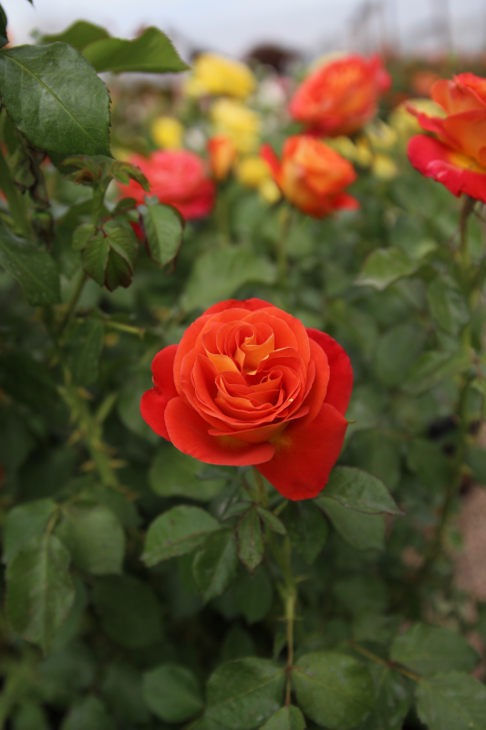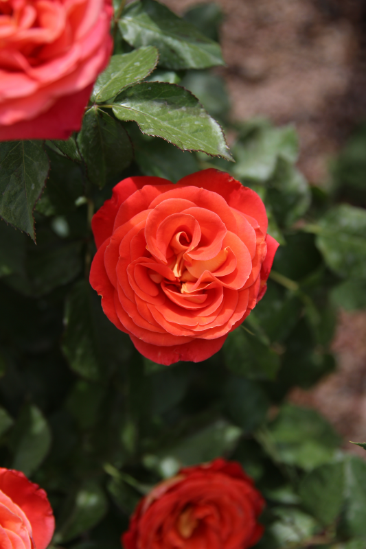 Vibrant, orange-red blooms mature to salmon-pink on outer petals, and exude a heady fragrance with lemony overtones. Compact, free-flowering shrub is ideal for containers. Tea rose / lemon scent.
