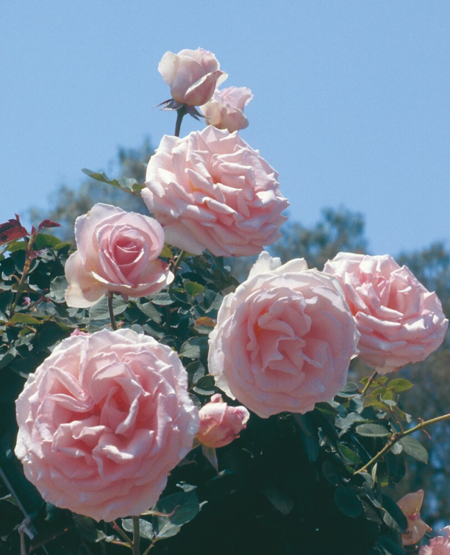 Here's a heavenly honey of a hard-to-come-by hue in climbing roses…pure pastel pink. Just like it's 'Mom', America, she's got big gorgeous well-formed flowers saturated with sweet spicy perfume. Same growth habit, too. But the difference is the angelic soft pink color. Blooms on new and old wood. Free flowering. A little late to bloom in spring.