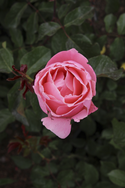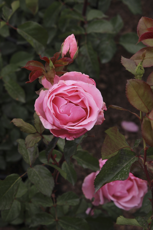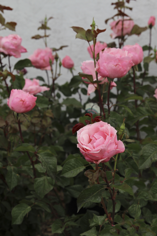 Medium-large, double, clear pink blooms borne singly and in clusters with a light tea rose fragrance.