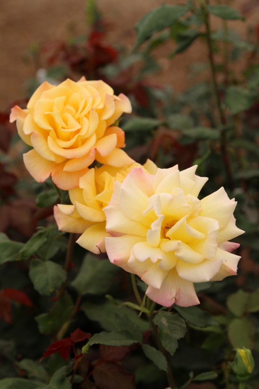 Medium, double flowers with a light fragrance are bright yellow edged in orange. The medium, rounded plant has medium green foliage.
