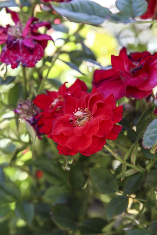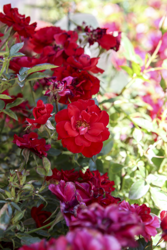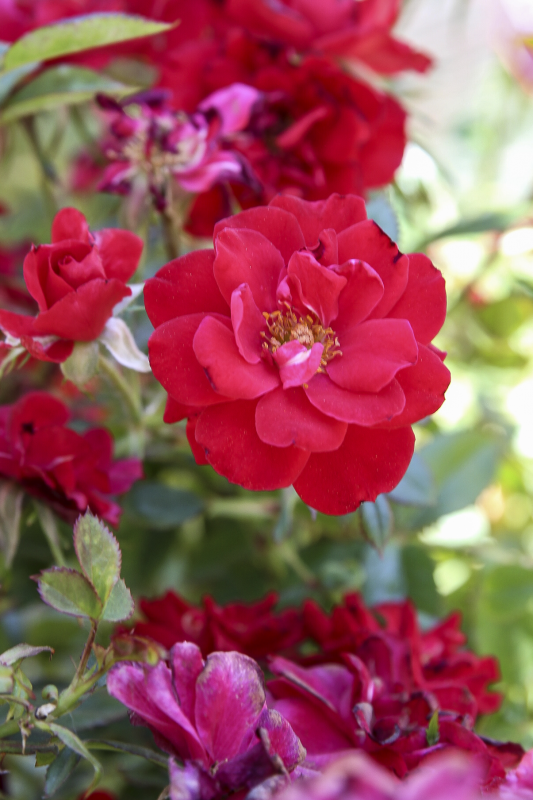 Medium, double, cherry red flowers, with a light fragrance, hold their color well.