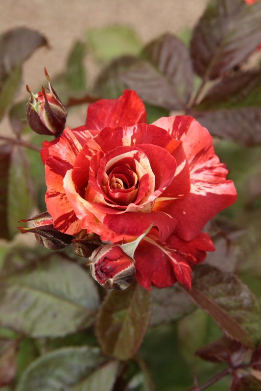 Flowers are rich sunset-like orange with bright cream stripes. The effect is accentuated by a layer of purple smoke creating a burnt orange combo, perfect for a stormy sky.