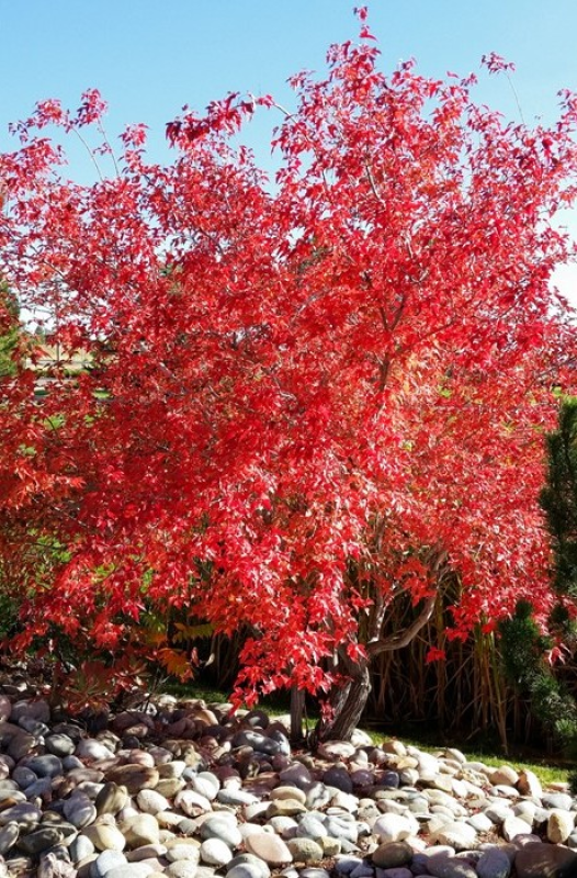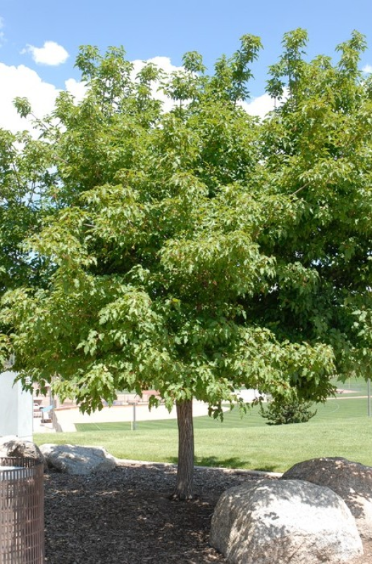 Glossy, green, lobed foliage and sprays of small, fragrant, yellow blooms on slender branches in spring. Radiant scarlet-red fall foliage and samaras. Prefers acidic, well-drained soil. Adaptable, extremely hardy and drought tolerant once established. Prune only in full-leaf as needed.