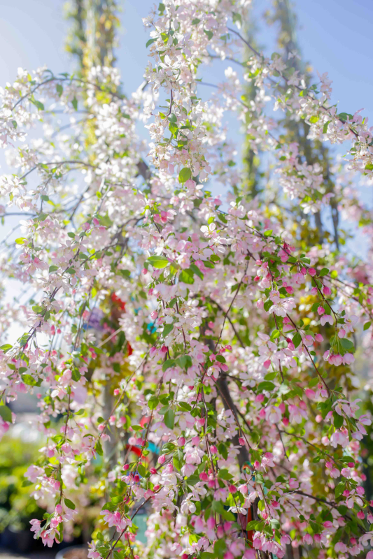 A pink-flowering weeping crabapple tree with excellent form and dark green, glossy foliage.