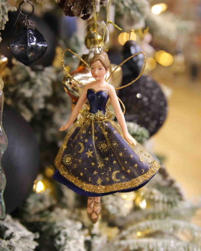 Invite a touch of magic and starlight to your Christmas tree with the Celestial Fairy Ornament. This exquisite ornament captures a serene fairy figure, beautifully crafted in detailed resin. The design emphasizes a celestial or ethereal theme, featuring delicate wings, a flowing gown, and elements of the night sky, stars, & moons.
