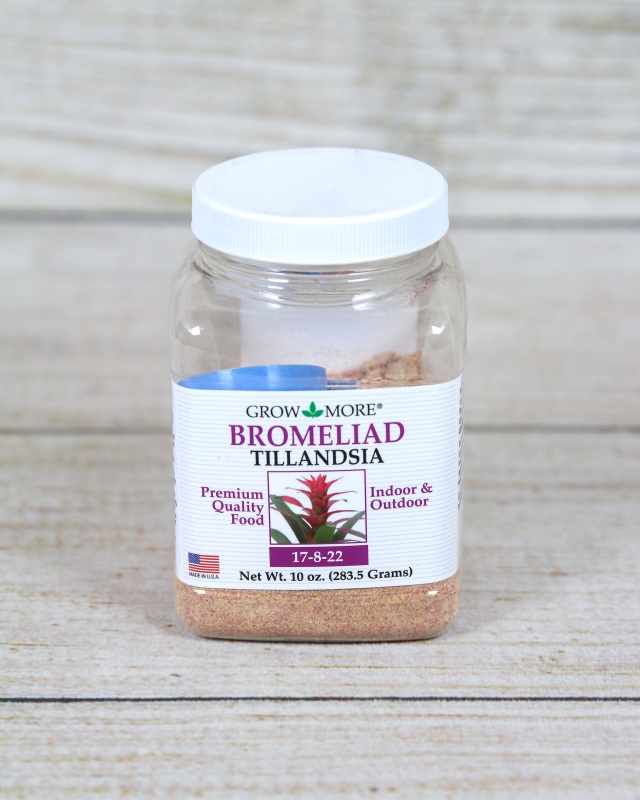 Grow More Bromeliad and Tillandsia Plant Food is a safe and effective way to fertilize your bromeliads and Tillandsia plants. Recommended for all Bromliaceae family plants including Bromeliads, Tillandsias, and Guzmanias, grown in pots of loose, fast-draining soil or as epiphytes on tree branches or slabs of bark. Feed lightly and frequently with both Bromeliads and Tillandsias during the growing season. Allow tillandsias to dry out between waterings.
